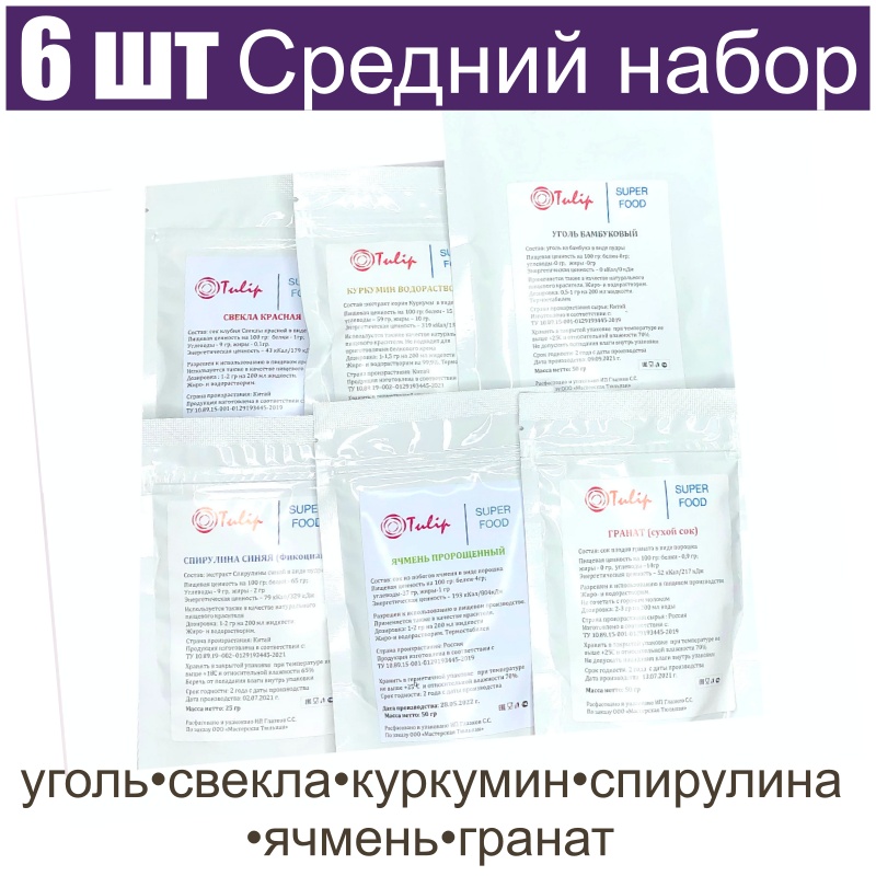 Средний набор 100% натуральных пищевых красителей, 6 цветов по 50 г. (25 г): свекла, куркумин, уголь, спирулина, ячмень, гранат - легко купить в интернет магазине. Бережно упакуем. Быстро доставвим. Промокод на скидку у нас на сайте!